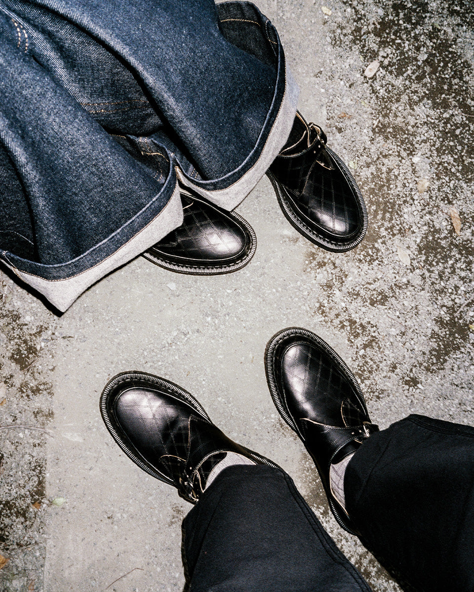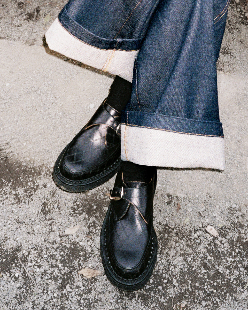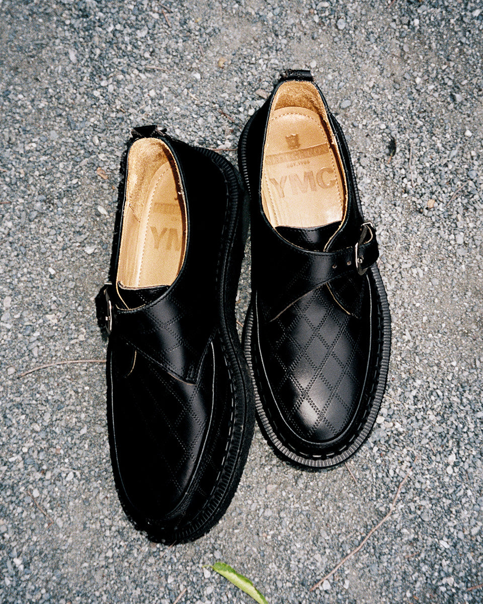 Taking material inspiration from YMC’s seasonal palette, the new George Cox x YMC Hatton Monk in argyle emboss black leather is a bold new collaboration. Constructed on our ripple sole wrapped with a crepe band, this style seamlessly blends function and utility with our historic core Creeper DNA. The Hatton Monk is a sophisticated yet impactful style which perfectly reflects the intersection of YMC and George Cox.