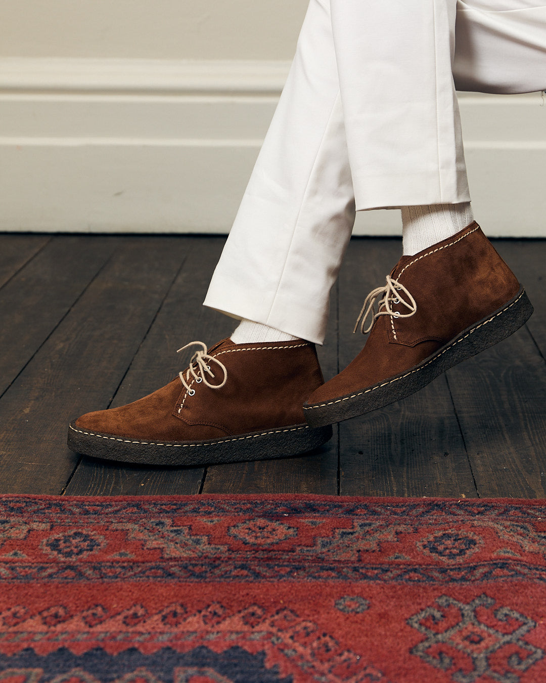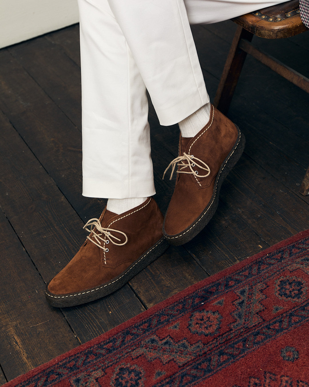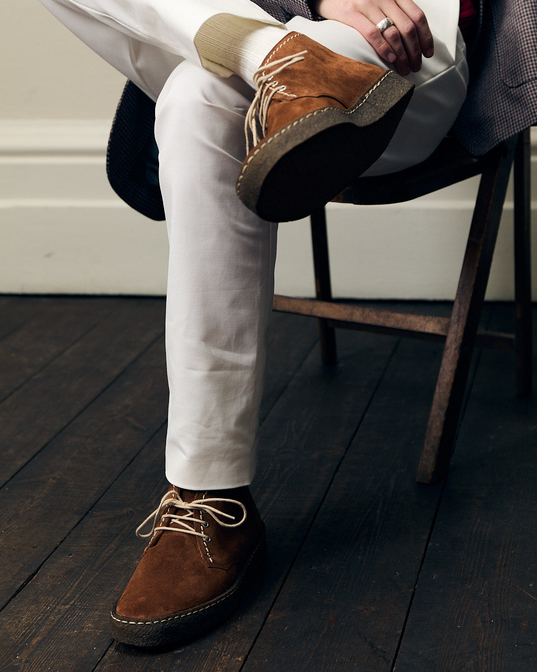 The Crepe wrapped ripple sole is a combination of our durable branded rubber ripple sole with a crepe strip called a ‘foxing’, which is wrapped around the midsole to blend our heritage material with the robustness of the rubber outsole.